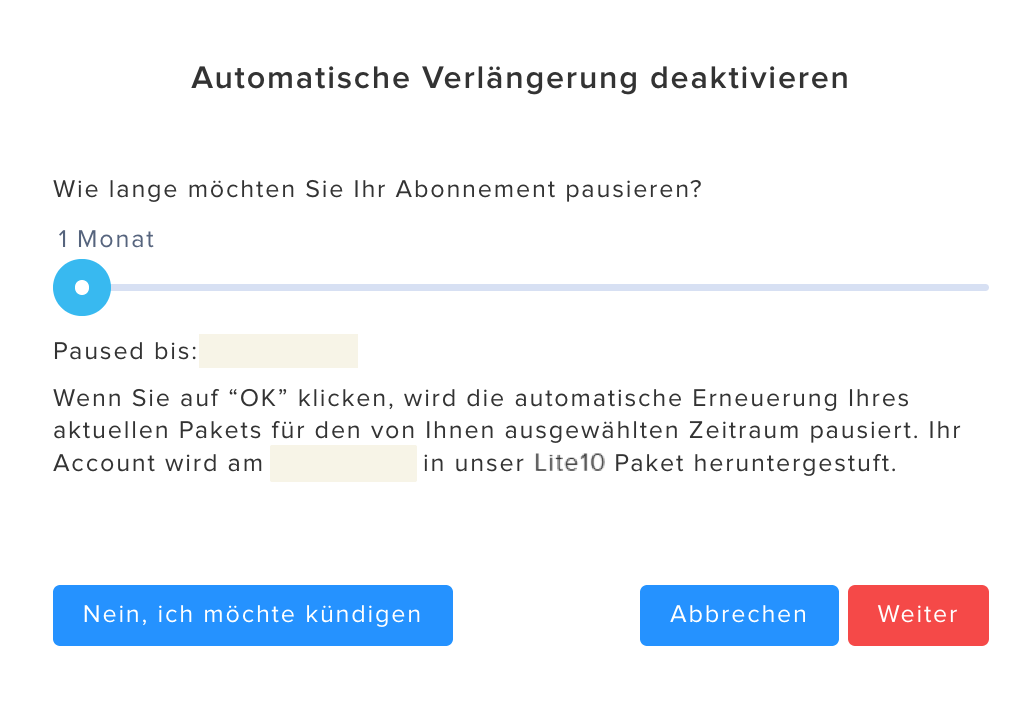 Bis zu 6 Monate können Sie die automatische Verlängerung Ihres Abonnements unterbrechen. Wählen Sie anhand des blauen Punktes den gewünschten Zeitraum aus und bestätigen Sie mit "weiter".